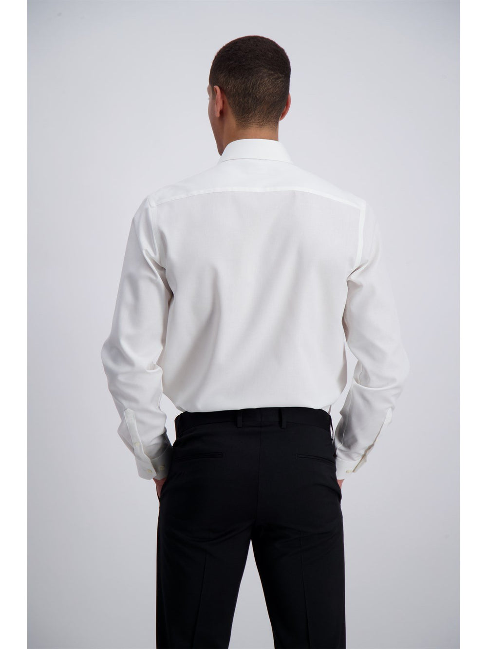 The shirt has a cutaway collar.
