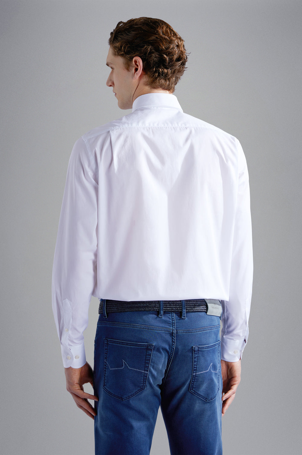 A menswear classic, rewritten with refined materials and sophisticated details. This shirt is crafted from cool, naturally breathable cotton poplin. Its straight cut with rounded hem ensures an elegant fit, elevated with a button-down collar and chest pocket. Embellished with striped pattern on the inside for a signature Paul & Shark touch.