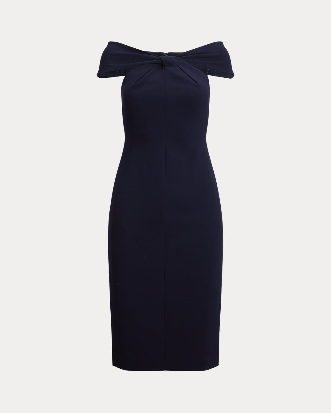 Distinguished by a twist-front off-the-shoulder neckline, this refined cocktail dress features a sheath silhouette crafted from smooth, stretch-infused crepe.
