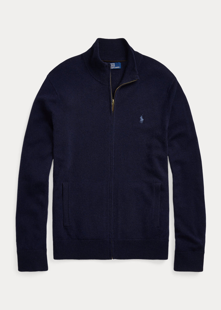 Rib-knit mockneck. Faux-suede piping on the interior back of the neck. Full-zip front with a suede zip pull.