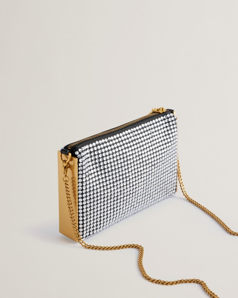 The small bag has golden plate decorations on the sides, the front and back have a crystal surface. Closes with a zipper, inside an open pocket. Detachable chain shoulder strap.