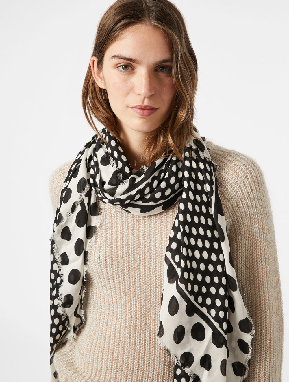 Modal stole printed with signature collection patterns. The lightweight, flowing model is embellished with a frame border and small fringes on all four sides. Size: 180 x 100 cm. Easy to combine with plain colours, to give a twist to the look.