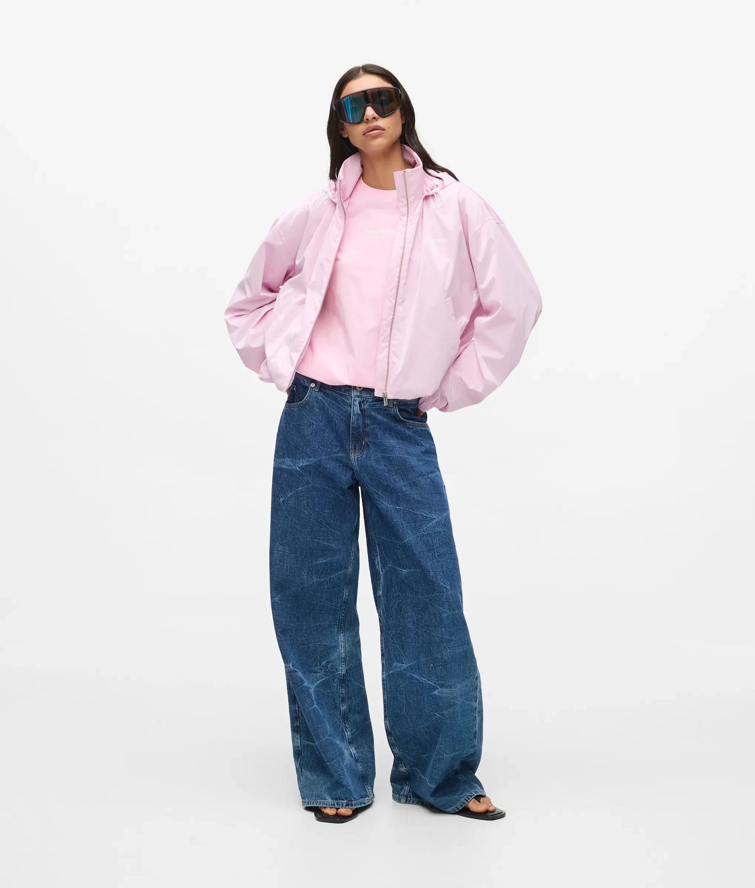 Bold, sleek, and unapologetically KARL LAGERFELD JEANS. Made from a glossy polyester-blend, this zip-up jacket takes a track-inspired silhouette and transforms it with a glossy finish.
