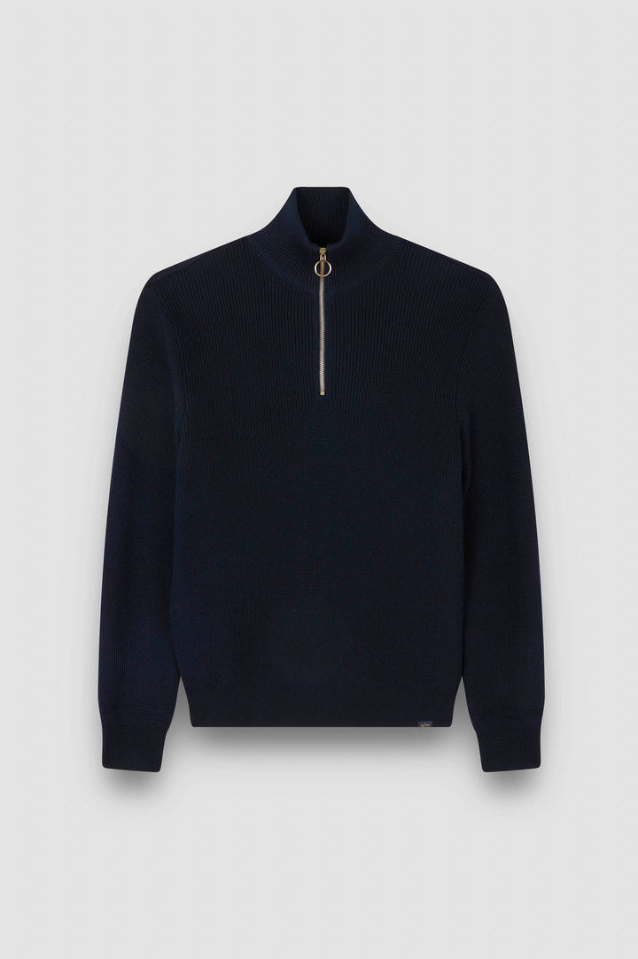 Perfect for off-duty outfits and city errands, this jumper is crafted from a soft and breathable technical wool blend, knitted with a chunky ribbed texture that pays homage to Paul & Shark’s sailing origins. Its high-neck design is warm and cosy, featuring a circular metal zip pull and ribbed trims that gracefully flex to your every movement, while maintaining the elegant proportions of the silhouette.