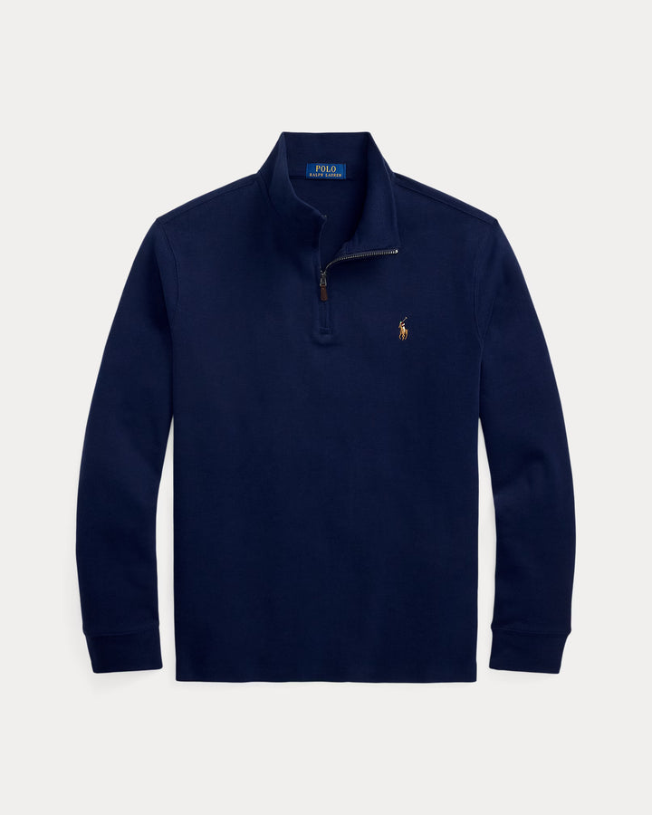 Mockneck. Quarter-zip placket. Zip pull custom-developed with a "Polo" logo.