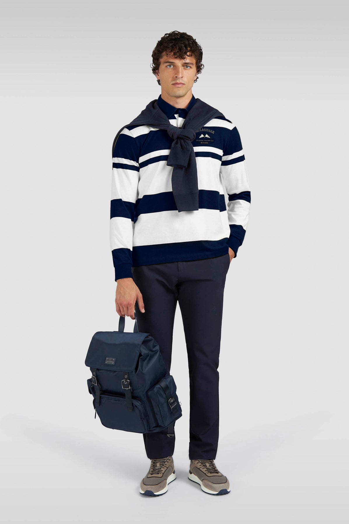 Paul and Shark’s take on the classic rugby shirt is designed to bring effortless elegance even to off-duty looks. Boasting a sophisticated yet easy-to-wear silhouette, this garment is crafted from cotton jersey with quintessential maxi stripes and a contrast fabric collar. Embroidered nautical flags on the chest pay homage to our rich sailing heritage.