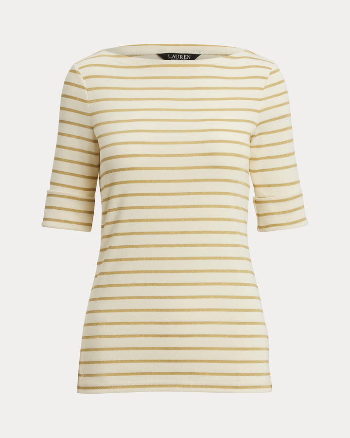 This stretch-cotton blend boatneck tee strikes a perfect balance between timeless style and modern appeal with its yarn-dyed metallic striped pattern.