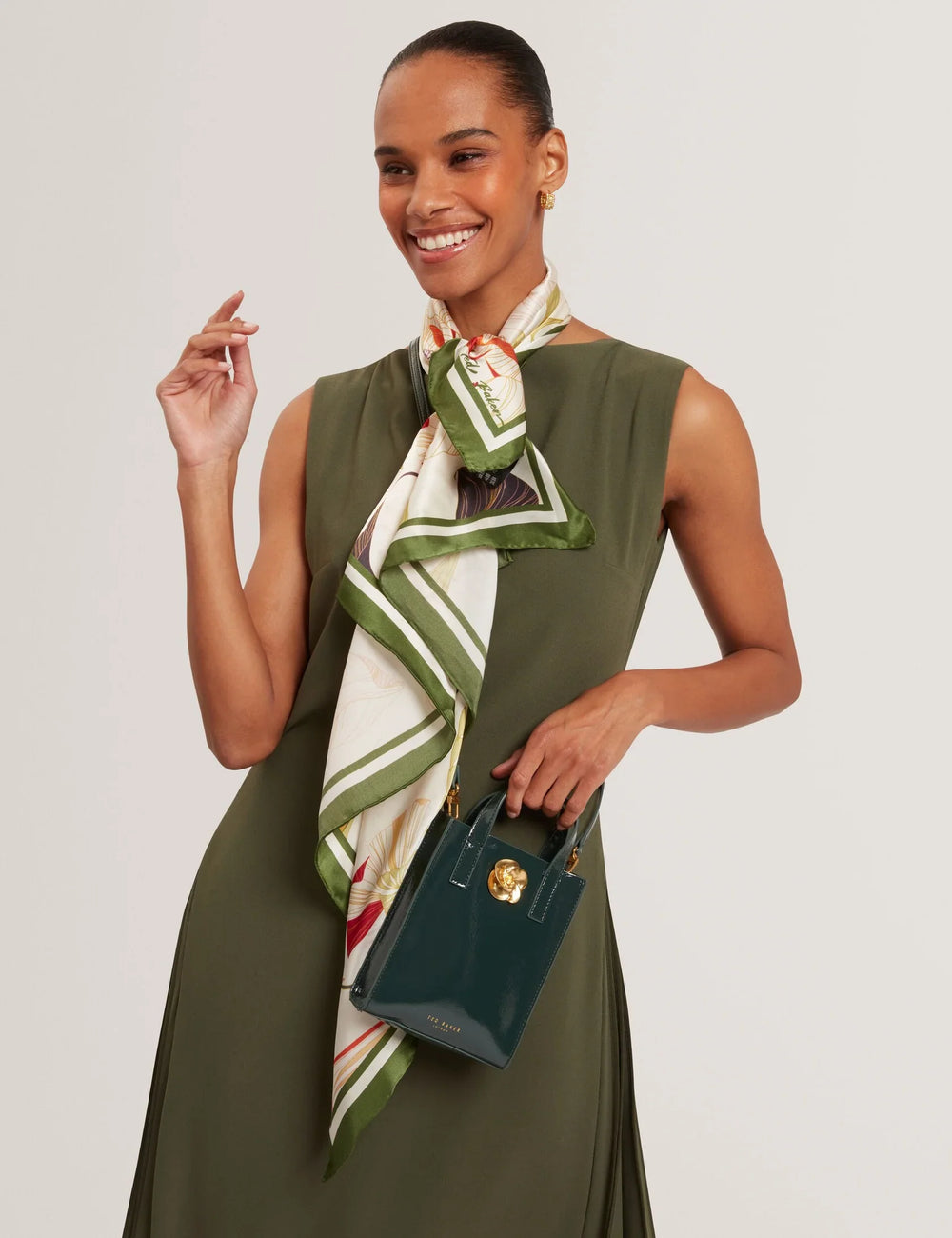 Set your outfit apart with the FLEURET square silk scarf. Designed with our art-nouveau inspired floral print, it exudes elegant glamour whether styled as a neck tie or added to your favourite tote bag.