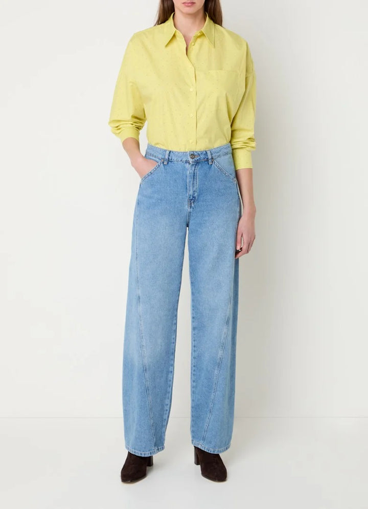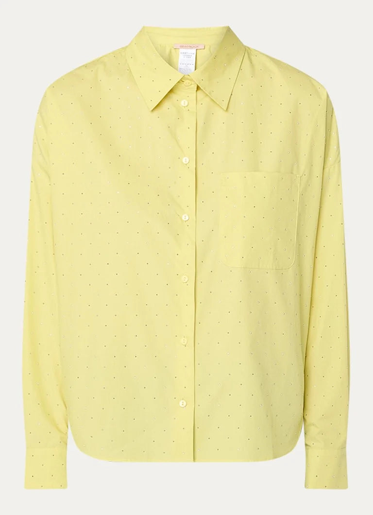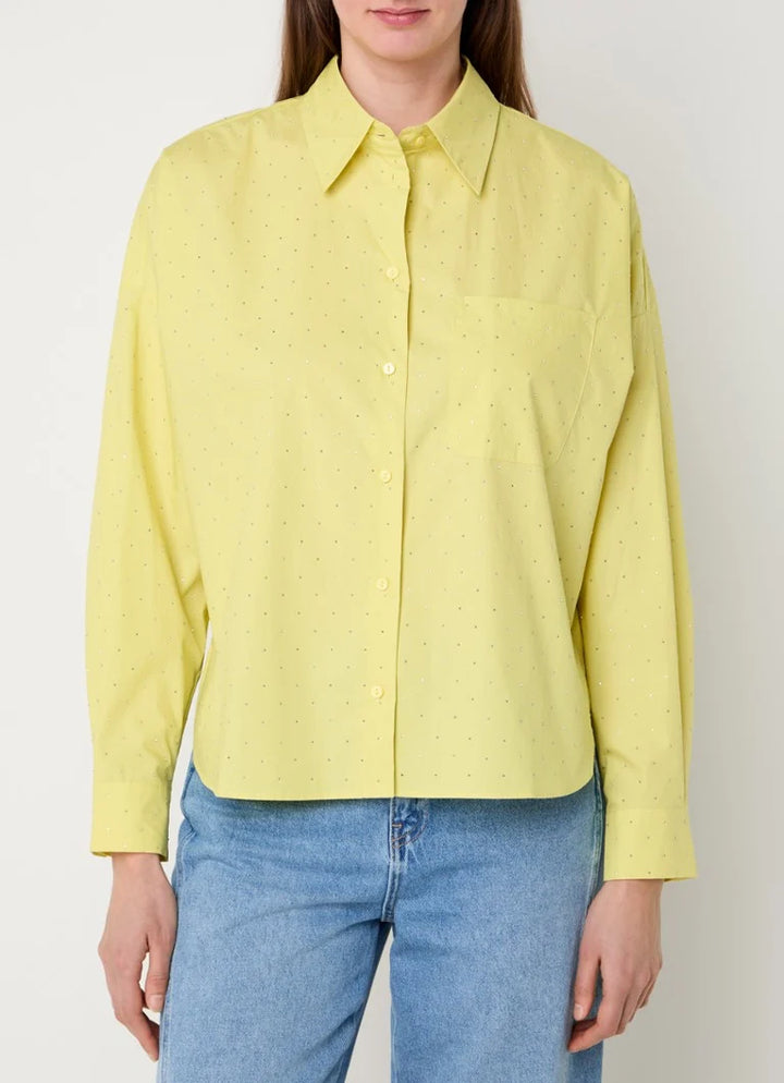 Oversized shirt in cotton poplin fabric featuring all-over rhinestone appliqués. The drop-shoulder model boasts a straight, comfort fit. Breast pocket and rounded hem slit detail, in addition to a darted yoke and box pleat at the back.