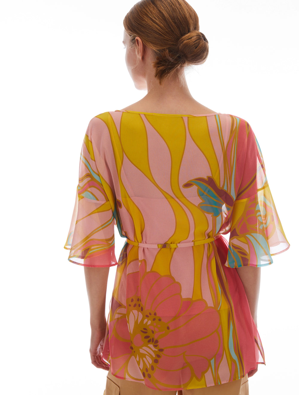Georgette blouse featuring a sorbet-hued pattern. The tunic-style model boasts side slit detail and a figure-hugging fit, thanks to the matching belt. Gathered boat front neckline and wavy ruffle-adorned sleeves. Comes with a sheer effect-reducing camisole.